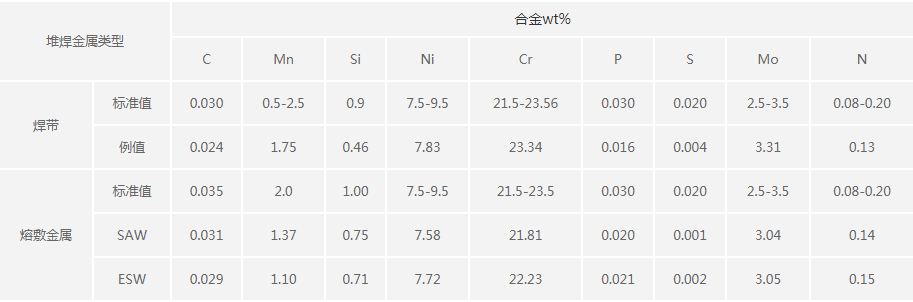 奧氏體-鐵素體雙相不銹鋼焊帶;在FRW-Q309MoL過渡堆焊層上堆焊成型或直接堆焊成型, 搭配SJ225焊劑用于電弧堆焊,搭配SJ25B用于帶極電渣堆焊,熔覆金屬具有奧氏體-鐵素體雙相組織,具有良好的綜合性能和耐腐蝕性。堆焊效率高,母材稀釋率低,焊道成型美觀,搭接平滑;